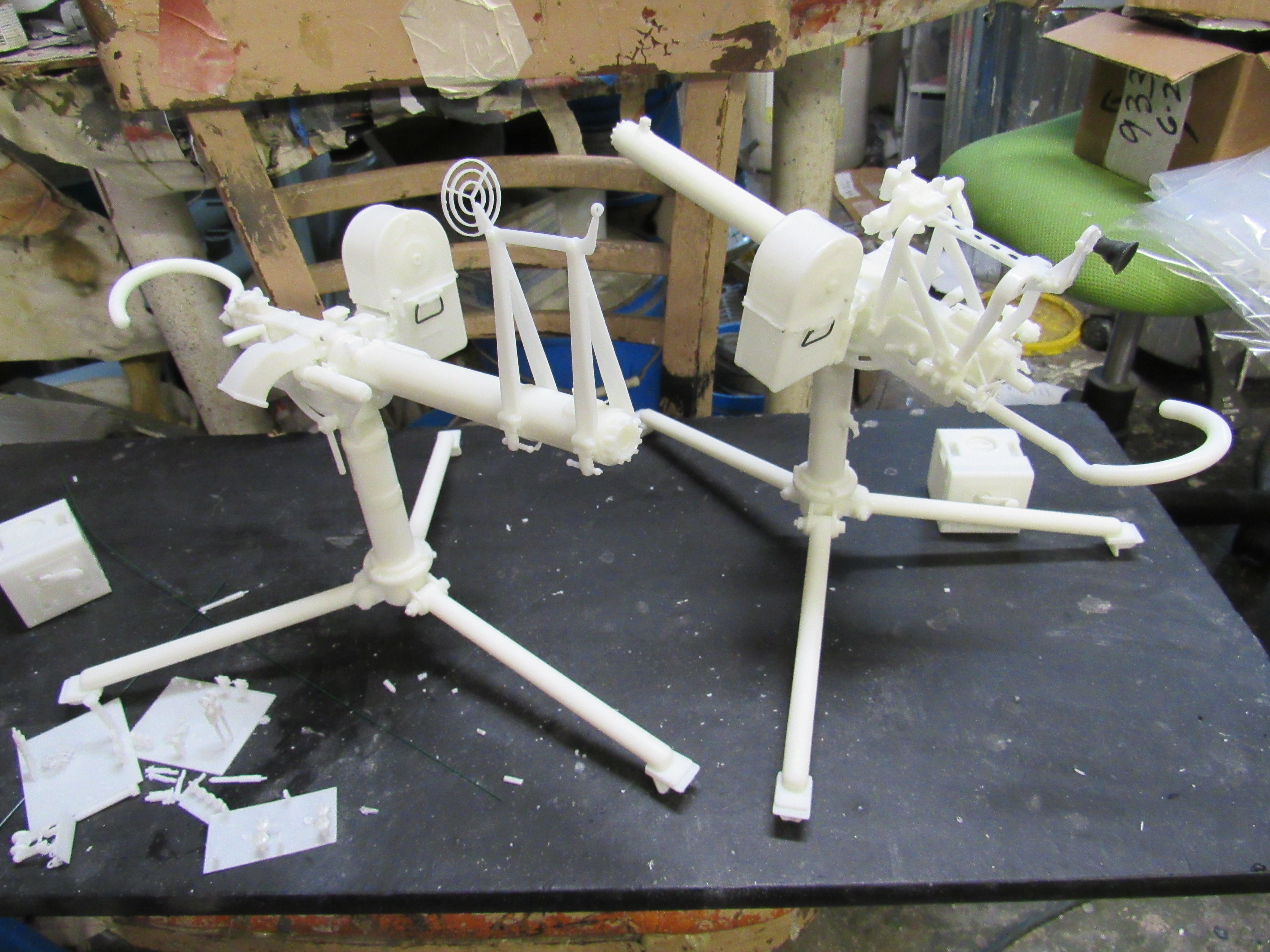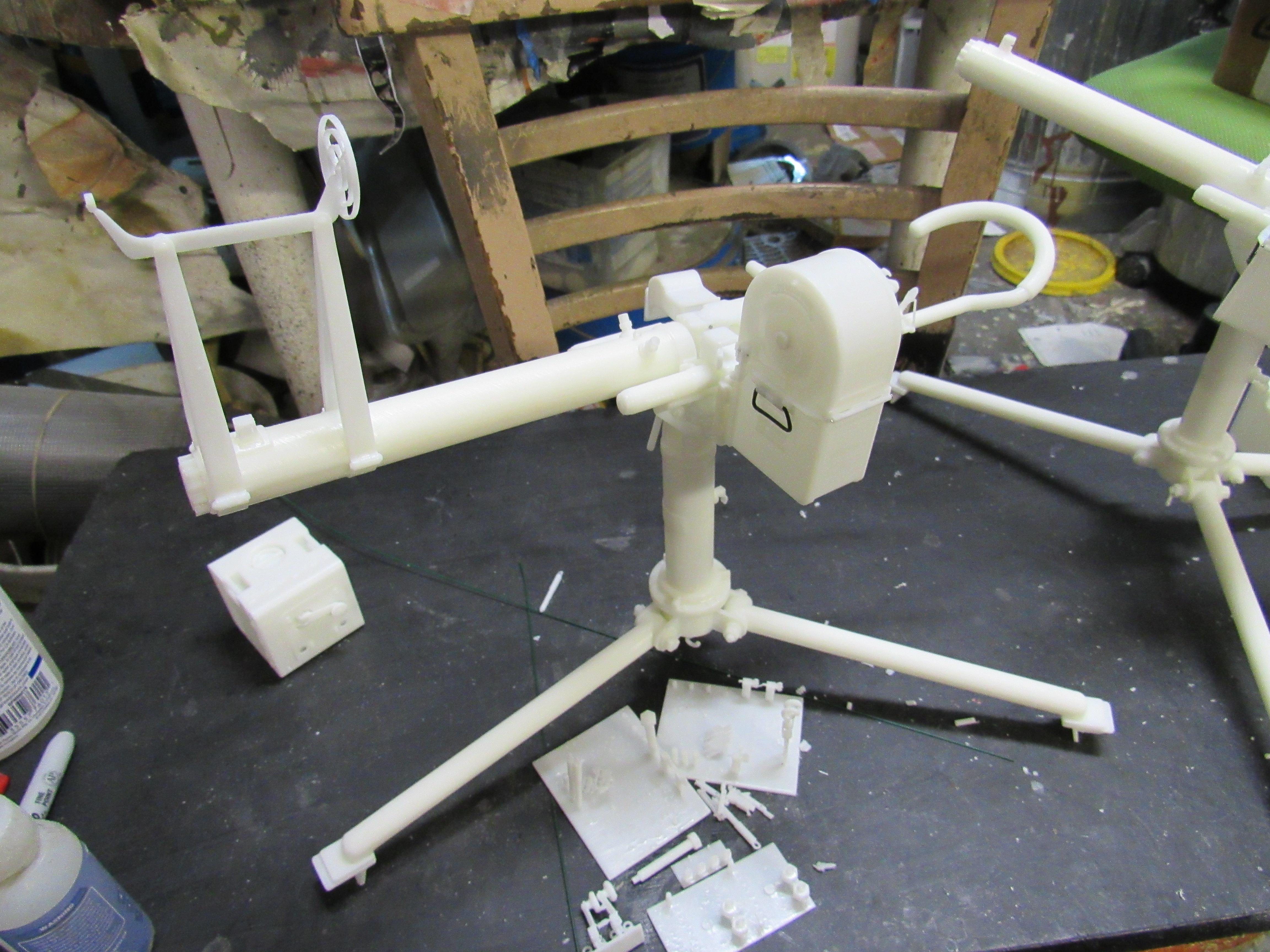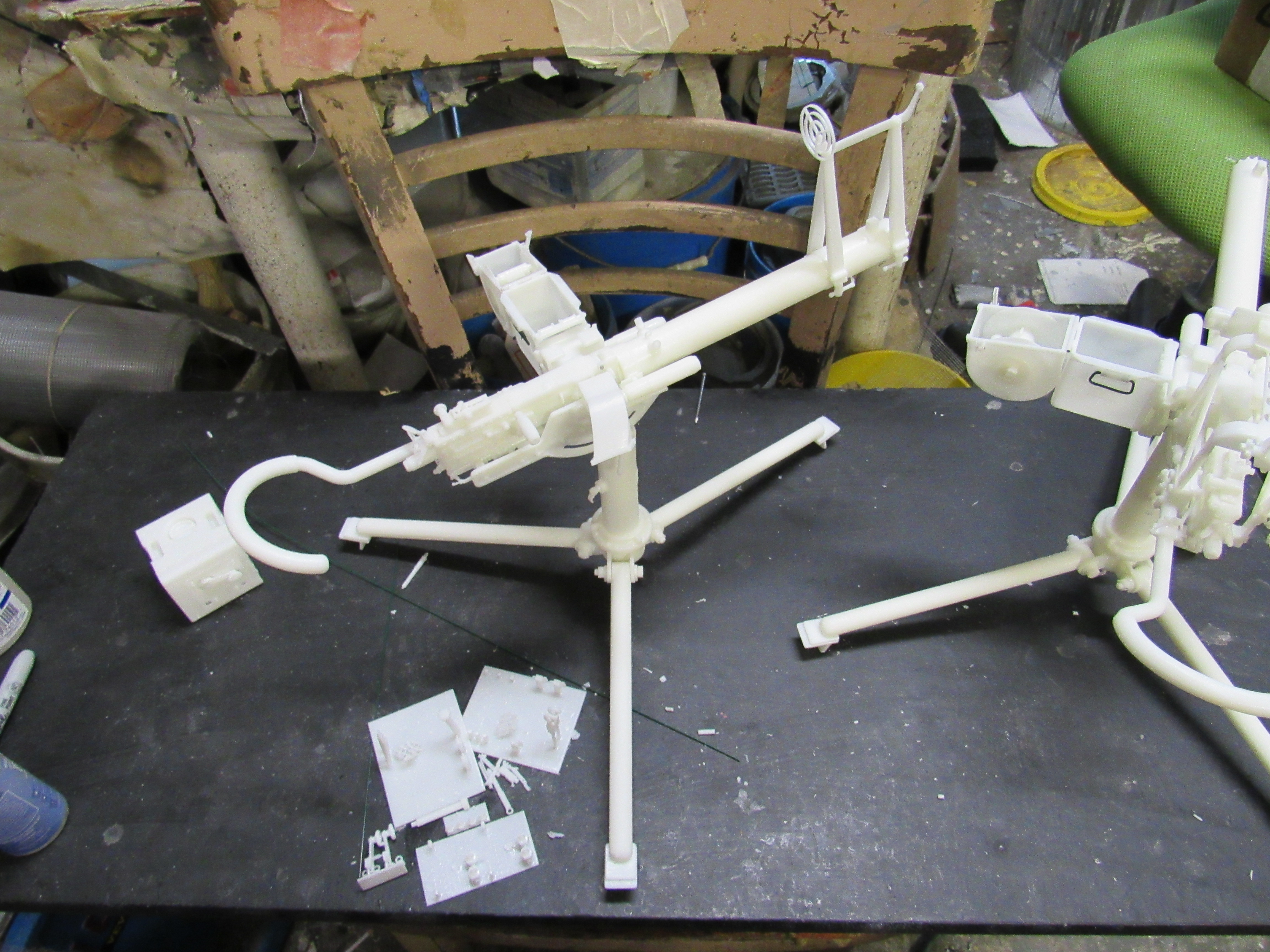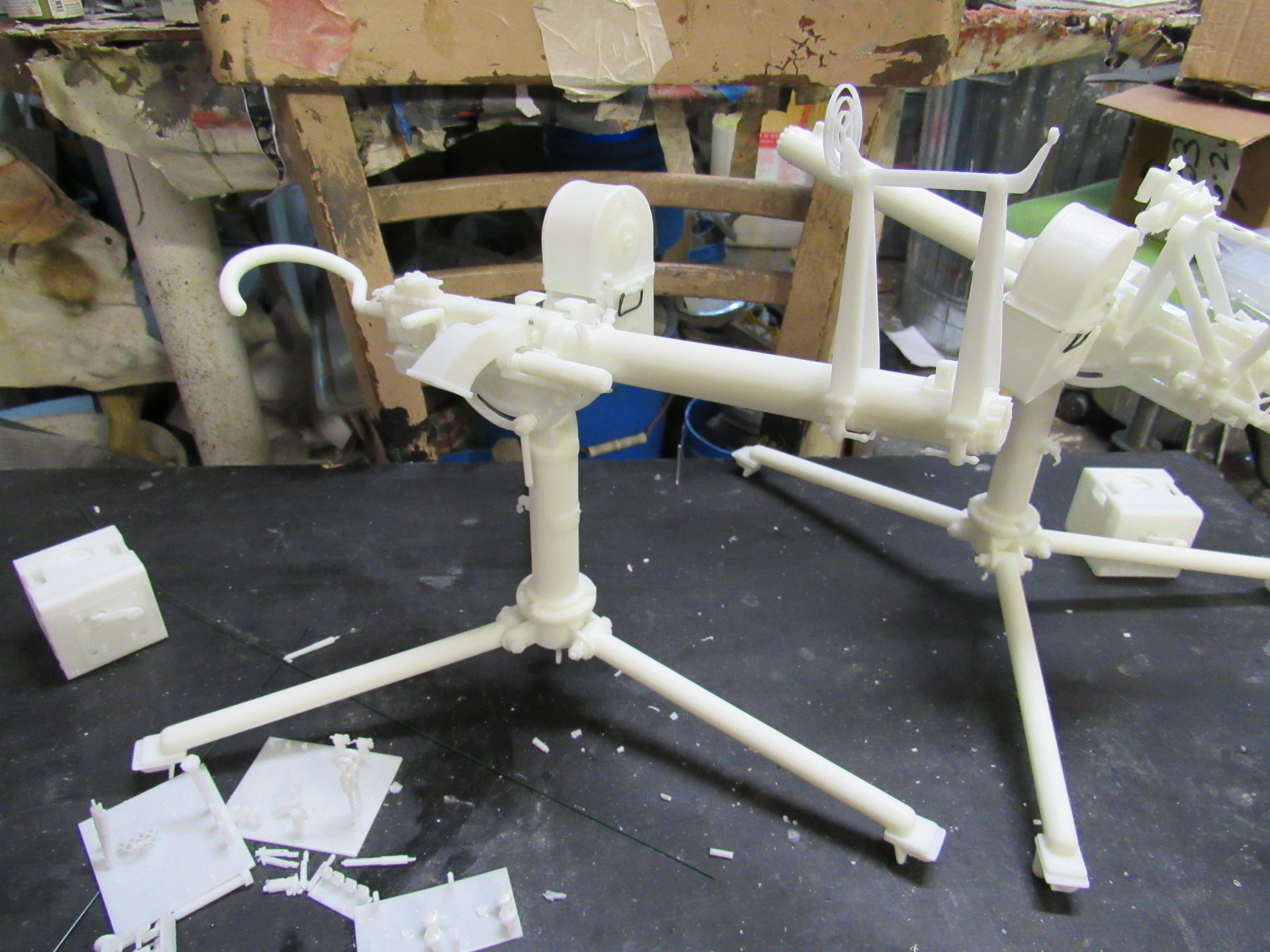 ![]() ![]() ![]() ![]() 3D Printed US M2 AA Heavy tripod mount full kit style 6 air cooled Long optic. This unit is fully detailed complete with all the detailing of the real unit. This would include the counter balancer gear system, the coil spring recoil dampening system, the paddle trigger assembly, the gunner waist hook, and the spent link chute. The unit also comes with the air cooled M2HB Browning MG, metal Chain, Tombstone 200 rnd ammo can, and water tube details. Everything is 3D printed, and most of the kit's components are integrally printed as a single unit to cut down on part count and to simplify the build. Style 2 has an elevated optic tower printed to the cradle. Also found on the tower are the rear optic mount, translucent resin long optic, front sight base, front sight mount, and the adjustment knobs for front sight elevation and windage adjustment...$270.00 each kit